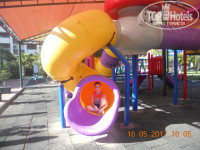 Для маленьких детей на пляже есть качели и пластиковые горки.