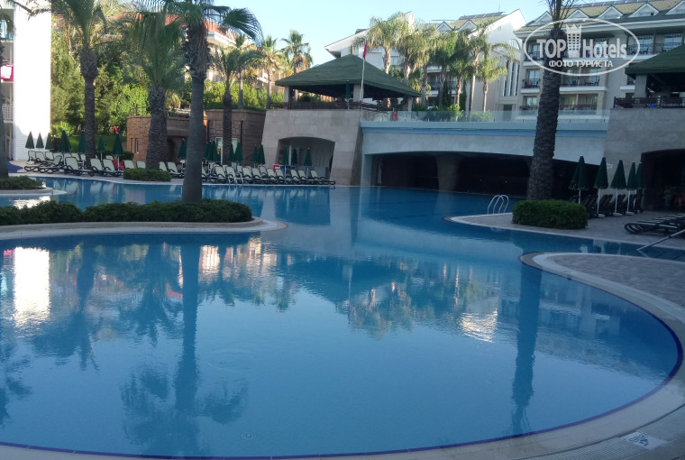 На территории отеля несколько бассейнов, один из них с горками. Некоторые там находятся с утра и до вечера. Мы приходили покататься с горок, т.к. для купания нам хватало моря. Море чистое. Дно песчаное, но есть камни. Мы по незнанию в первый день порезались.Потом купались ближе к пирсу. Свободные лежаки и зонты можно найти всегда, но возможно они будут не в первой линии к морю.