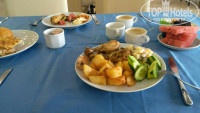 Зато нам понравилось,как нас кормили, на завтрак всегда были йогурты и сухие завтраки,джемы,мед. Молоко.Овощная нарезка,фрукты. Каша молочная (рис залит молоком или овсянка),выпечка,масло сливочное, яйца вареные,сосиски бумажные. Иногда жарили толстые блины и омлет. Кофе из автомата вкусный! Очередей на завтраке не было. На обед и ужин всегда был суп одного вида, иногда подавали с вкусными сухариками. Макароны,спагетти или лапша,рис,фасоль,бабовые,жареный картофель или пюре,овощное рагу. Из мяса всегда была курица и баранина,пару раз давали говядину и печень. Были салаты,заправленные лимонным соком или наткральным йогуртом/кефиром. Овощная нарезка и много зелени,печеные на гриле баклажаны,кабачки,перцы. Каждый день были фрукты,много,всем хватало! Арбуз,дыня,яблоки, сливы,апельсины и лимоны. Много сладостей и выпечки, мини-пиццы-пироги и лаваш из печи. Последние три дня овощи нарезали прямо в зале и можно было увидеть,какие они свежие и красивые. Вода бутилированная была всегда и в достатке. В баре при пляже пекли лепешки с начинкой сырной и сырно-колбасной. С 10 часов утра в баре при столовой и при пляже разливали напитки,алкоголь. Из алкоголя было пиво,вино,водка, но мы не пробовали.