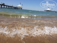 Немного о водных процедурах: отель имеет 2 больших бассейна, оба удобны для детей! и 1 бассейн совсем для малышей глубиной в 40 см и горкой слоник. Еще в один бассейн спускаются с водных горок, их там три. Все компактно находится в отеле, все рядом, что очень удобно! Море голубого цвета, с пирсом посередине, рядом пляж у другого отеля, мы чаще плавали там, поскольку у нашего моря на дне песок, но попадаются большие валуны! Просьба к отелю, разоритесь на технику и выковырейте их! Об них легко поцарапаться!!! Пляж чистый песочек, лежаки и полотенца бесплатно. Бар на пляже тоже присутствует! Водные виды спорта платно.