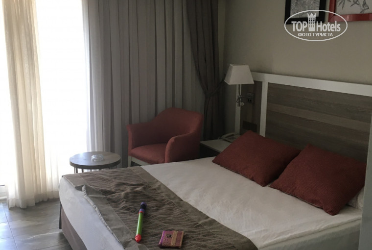 Хочу теперь я поделиться своими впечатлениями об данном отеле. Путёвку покупали за 1,5 месяца. Поэтому отзывы мониторила. Хочу сразу сказать что этот отель находится в пятёрки самых бюджетных 5* в Сиде. И поэтому ждать от него что то эксклюзивного нет смысла. Конечно это не 5*, скорее хорошая 4*!!! И ещё не понимаю отзывы людей которые в минус отелю пишут :далеко от моря! И нет территории!!! В описании отеля вся информация есть. Или люди думают, что к их приезду море станет ближе, и отель обзаведется территорией в 2 гектара )))) поэтому понимая все минусы этой пятёрки все таки решила выбрать ее (опять-таки из-за цены). Отдыхали 11 дней с дочкой 8 лет. Летели турецкими авиалиниями. Перелет был отличным, поэтому настроение не было испорчено. Приехали в отель в 9-00 утра, сразу одели браслеты и пошли на завтрак. Заселили нас только в 14-00 (так по концепции отеля, поэтому не ругалась и не пытались всячески ускорить заселение). нас заселили на 1 этаж, где лобби. Но номер оказался для инвалидов с пандусами в ванной и в самом номере. С раковиной где то в районе пола. Может быть я бы в нем и осталась, но воды не было в номере, а ждать сантехника я уже была не в силе. Поэтому пошла на ресепшн и мне поменяли сразу номер на 6 этаже, правда пришлось отблагодарить (5$). Оплачивала номер эконом (с расчетом, что все эти номера выходят на поле, чтоб не слышать музыку с бассейна. А нам в итоге достался номер с видам горок и бассейнов -слева, и моря с права. Музыка слышна только до 23-30 потом тихо.