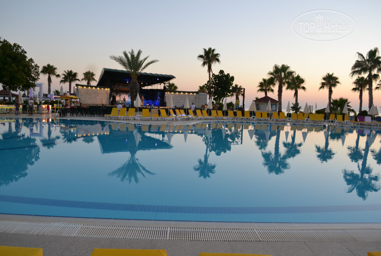 Территория просто шикарная, ухоженная, чистая, зеленная! Бассейны, водные горки, тренажеры на воздухе, бары, рестораны, ночной клуб, кальянная, уютные места, магазинчики, как маленький городок. Хорошее отношение персонала. В главном корпусе есть магазин, цены там не сколько не выше,чем на пятничном базаре. Полотенца мы НЕ брали под депозит, а покупали в низу за 5$-очень хорошее качество! Для деток несколько хорошо оборудованных площадок, бассейны, водные горки, детский клуб и конечно ежедневные диско. На территории отеля все комфортно расположено, хоть на фото и кажется, что море далековато, но это не так, от главного корпуса идти минуты 3. Хочется отметить, что все корпуса расположены компактно и близко к морю, кроме Moonlight, он чуть дальше. Moonlight вообще как отдельный маленький отель, со своей не большой столовой, баром и бассейном.