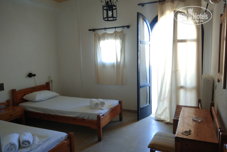 Номер 105 достаточно просторный. Он находится на 2-м этаже здания, напротив лестницы и лифта. Обстановку номера составляют две полуторные кровати, удобные, застеленные хорошим чистым белым бельём (также на каждой кровати лежали два белоснежных махровых полотенца (среднее и большое) и белое покрывало-простыня), тумбочка между кроватей, стол с зеркалом над ним, стул, табурет и скамья возле стола. Большой трёхстворчатый шкаф стоит у входа в номер, напротив двери в ванную комнату (в шкафу лежат тёплые одеяла). Вся мебель, окно и балконная дверь деревянные. Есть кондиционер (платный, не пользовались). Телевизора в номере нет. Как уже многие писали, есть старинное радио, муж тоже побаловался поиском работающих каналов) На лоджии стоят пластиковые стол и два стула. Для сушки белья в номере ничего нет. Я привязала на балконе верёвку, которая (с прищепками) всегда в моём рюкзаке. Никакой посуды в номере нет. У нас были взяты с собой мини-чайник, по паре пластиковых кружек и тарелок. Пробовали кипятить воду из-под крана действительно солоноватая. Когда постиранная чёрная одежда высохла, на ней остались белые пятна. Мы в первый же день купили большую упаковку воды (6*1,5 литра за 1,3 евро в супермаркете Daskalakis, покупали дважды за 4 дня, как раз хватило). Холодильника в номере нет, приходилось покупать фрукты-йогурт на день. Я слышала, как кто-то из туристов спрашивал Христофера, можно ли положить купленные продукты в холодильник. Где холодильник находится, сколько стоит эта услуга не знаю, мы обошлись без этого. Ванная комната просторная, душевой уголок действительно без шторки, но на пол вода не попадала. Под ноги положили взятое из дома небольшое полотенце. Из моющих средств 2 мини-мыла. Туалетную бумагу пополняли по необходимости. Всё работало исправно, не было проблем ни с сантехникой, ни с освещением. В отзывах люди жаловались на отсутствие горячей воды. Проверяла - горячая вода была действительно не круглые сутки. Но вода всегда была тёплая, вполне комфортная для принятия душа жарким летом. Уборка в номере производилась ежедневно, не могу сказать, влажная или сухая, так как мы при этом не присутствовали. Один раз (т.е. раз в 2 дня) была смена полотенец. Работница отеля Татьяна давно живущая в Греции белоруска, приветливая женщина. Мы не прятали ничего из своих вещей. Ноутбук, документы, электронная книжка - всё спокойно лежало в рюкзаках в шкафу и в тумбочке. Татьяна предложила нам домашнее оливковое масло extra virgin, по цене 6 евро за литр. Сравнив цены, мы решили купить через неё. Масло, конечно, не самого первого отжима, но хорошее, и стоило дешевле аналогичного, продающегося в Сталиде. Интернет через Wi-Fi есть на первом, административном этаже отеля. В зоне лобби стоят несколько удобных диванов, есть телевизор, бар. На инфо-стенде, помимо информации от ТО, есть расписание автобусов из Сталиды в Ираклион и обратно, а также небольшая информация о Крите. На нашей лоджии иногда можно было поймать открытый Wi-Fi от отеля Cactus Royal.