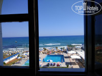 Теперь остановлюсь на местоположении отеля. Оно просто отличное! Отель находится в конце Сталиды, ближе к Малии. Конечно, первая линия это первый и большой плюс (для меня потому, что возле берега намного прохладнее). Территория отеля достаточно большая, с большой парковкой (парковка находилась как раз под нашей лоджией, но это не мешало отдыху). Перед входом растут несколько деревьев, под ними подвешены кресла-гамаки. С другой стороны входа стоят несколько столиков. По нашей стороне здания напротив окон был небольшой пустырь, по дорожке вдоль отеля часто проходили на пляж туристы из соседних отелей. Другая сторона отеля закрыта забором. С нулевого этажа, с заднего торца здания, есть выход к бассейну и морю, на этом этаже есть несколько туалетов для отдыхающих у бассейна и моря. За зданием отеля сначала расположена большая бетонная площадка, после неё зона бассейна и бара при нём. Бассейн средних размеров, состоит из глубокой части, над которой проложен мостик, и небольшого лягушатника. Вода была чистая, слегка пахла хлоркой (бассейн заполнили на второй день нашего пребывания). Вокруг бассейна стоят лежаки с зонтиками, мы приходили в разное время, утром, днём, вечером, и находили свободные лежаки. Для отдыхающих в отеле лежаки бесплатные. Уж не знаю, как определили, что мы проживаем в отеле, к нам никто ни разу не подходил. На выходе с моря есть душ. Удобно, что эта часть отельной территории расположена на невысоком холме. В первые 2 дня были сильные волны (красный флаг), лежаки на берегу захлёстывало водой, а на зону вокруг отеля не попадало ни капли. Кстати, и при красном флаге разрешали купаться в море, только следили, чтобы не заплывали далеко. Морское дно прямо напротив бассейна каменистое, а совсем немного влево уже один песок. Дно неглубокое, заход очень плавный. В последний день море практически успокоилось, и я поплыла далеко. Проплыв около 100 метров, случайно опустила ноги и встала на дно по плечи! Вода достаточно чистая, прозрачная. Конечно, после шторма наносило водоросли, но это нормальное явление.