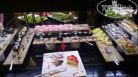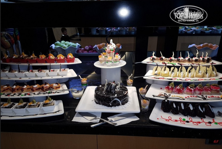 Что нас всех убило, это столы с кондитерскими изделиями и закусками!!! А именно - пирожные были разложены на КЕРАМИЧЕСКИХ ПЛИТКАХ (см. фото), которые используются при отделке помещения. В частности эта же плитка "под ламинат" уложена у бассейна и на балконах в номерах! ЭТО ОЧЕНЬ СЕРЬЕЗНОЕ НАРУШЕНИЕ САНИТАРНЫХ НОРМ! И дело тут в первую очередь не в эстетике. Строительные и отделочные материалы не предназначены для того, чтобы контактировать с пищей в принципе. Например, в той же керамической плитке есть допустимые фоновые нормы естественной природной радиации, которые в разы больше, чем в пищевой посуде. Та же глина, которая имеется у плитки и не покрыта глазурью имеет пористость - а это источник для различного рода бактерий. К тому же плитка может содержать различные химические соединения, в т.ч. и соли тяжелых металлов. И вот на этом они подают пирожные, колбасу, сыр!!!