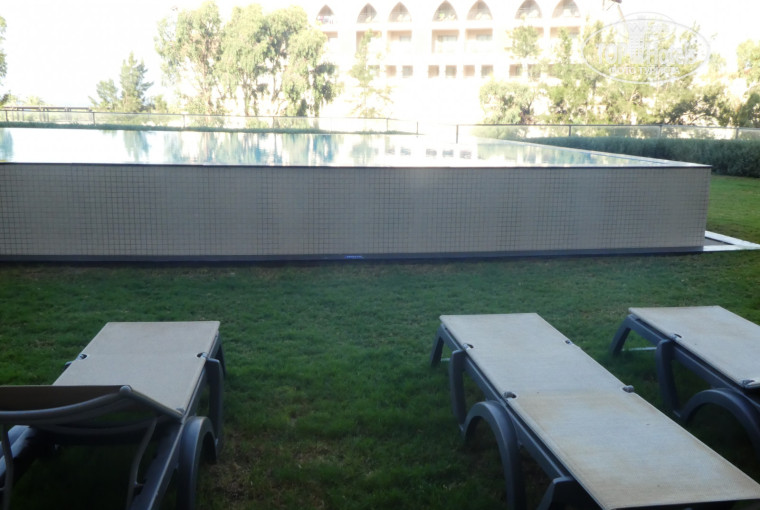 Номер. У нас был номер в основном здании с, так называемым, выходом к бассейну. Я реально не понимаю, за что с нас взяли доплату, тут скидку нужно делать огромную тем, кто живёт в этих номерах. Я недостаточно хорошо изучила вопрос и была потрясена, увидев вместо выхода в бассейн занюханную лужайку с огромным корытом, возвышающимся перед перед дверью террасы. Моя десятилетняя дочка брезгливо заглянула в это корыто, называемое бассейном, и сразу заявила, что купаться в нём нельзя, оно очень грязное. Я не буду подробно описывать это безобразие, достаточно посмотреть на фотографии, всё будет понятно. Поутру, открыв дверь террасы, мы услышали звуки стройки, шум работающего трактора, что-то крушили, ломали. Источник этого шума мы обнаружили много позже, иначе я бы потребовала сразу же поменять номер. Наш номер находился в крыле ресторана и бассейн по существу находится на крыше ресторана, а за углом нашего крыла мусорный блок ресторана с соответствующим шумом и запахами. Фотография так же прилагается.