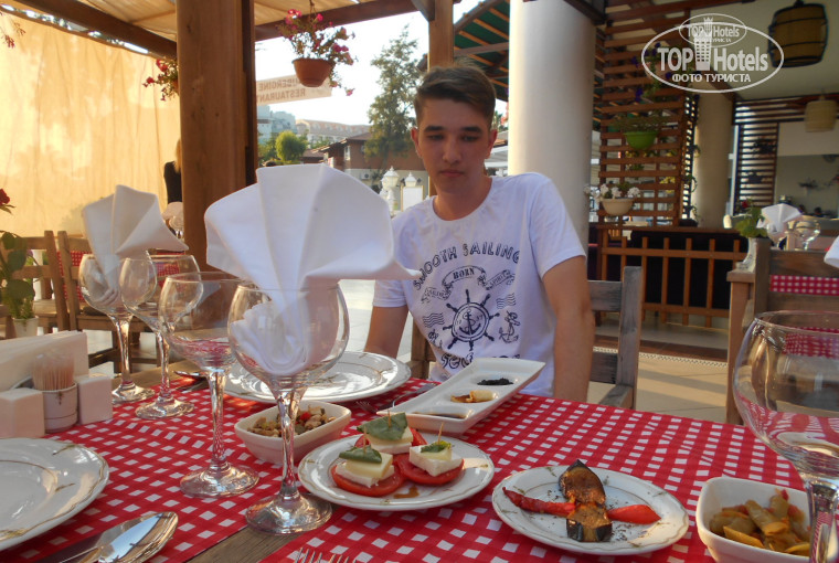 Питание: питание я считаю отличным для 4*. Многие не довольны питанием, но я так и не поняла чем. У меня сыну 19 лет и он всегда хочет есть, и когда я ехала я переживала, что он будет ходить голодный.Так вот я за 10 дней не разу не услышала, что он хочет есть, потому что еда там есть всегда и везде. На завтрак: яйца и вареные и яичница, булочки, йогурты, джемы разные, салаты, иногда блинчики, каши,мюсли, вафли ,печенья да можно найти чем позавтракать. А вот обед и ужин, я считаю вообще классный, чего только нет и рыба и курица, печень,мясо бывает, в последний наш день язык был очень вкусный, рис, супы, фрукты (апельсины, сливы, виноград, арбузы), выпечки и сладостей полным полно. Я пробовала только вино красное и пиво, вполне хорошее. Могу сказать точно не какой борьбы за мясо нет, когда кончается они тут же приносят еще.Мы на обед и ужин ходили или к началу или через минут 30 и всегда места были, если не на первом этаже, то на втором точно были места.Не разу не стояли и не ждали место. По поводу посуды, тарелки чистые, ножи вилки тоже. Встречается битая посуда, но я ее не брала, брала хорошую, но мне мало попадалась такая. Я человек не привередливый, поэтому я даже поправилась на 2 кг.