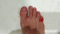 1) Небезопасный пляж. При заходе в море Вы с большой вероятностью порежете ноги об острые камни и ракушки. На 2-й день отдыха я глубоко порезал ступню левой ноги и после этого решил заходить в море с пирса. Но в предпоследний день, заходя в море с пирса, почти до кости порезал палец на правой ступне (смотрите фото). В тот же день при мне из море вышел парень с порезанной рукой, весь в крови. Многие отдыхающие в отеле ходят с перевязанными ступнями, а некоторые - даже хромают.