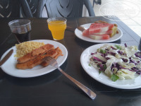 Ужин - какое-нибудь мясное блюдо (отбивная, жареная рыба, ну или что-то такое) и опять салаты. Бывает десерт в виде пирожных. Впрочем, всегда был арбуз, что на завтрак, что на обед, что на ужин, а по мне так вполне себе десерт.