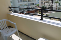 На балконе стоит два стула и маленький столик. У нас был боковой вид на море, бассейн и два другой корпус отеля.