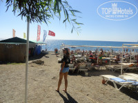 Море. Идти до него минут 7. Вход через территорию другого отеля. Закрывался после 7 вечера. Пляж был небольшой, мелкая галька, но вход был терпимый. Море было чистое, вход пологий. Метра 3-4 идет галька, потом большие камни, а потом песок. Можно наблюдать мелких рыбок, и если стоять неподвижно, они начинают кусаться:) Так что двигайтесь активно в море. В принципе, море спокойное. Но после 10 утра был лягушатник. Лежаков всем хватало в любое время. Также как у бассейна в отеле. В баре у моря были автоматы с соком и кофе, горячий чай, питьевая вода. Около нас были платные развлечения: прогулка на катере, банан, подушка, парашют и др.