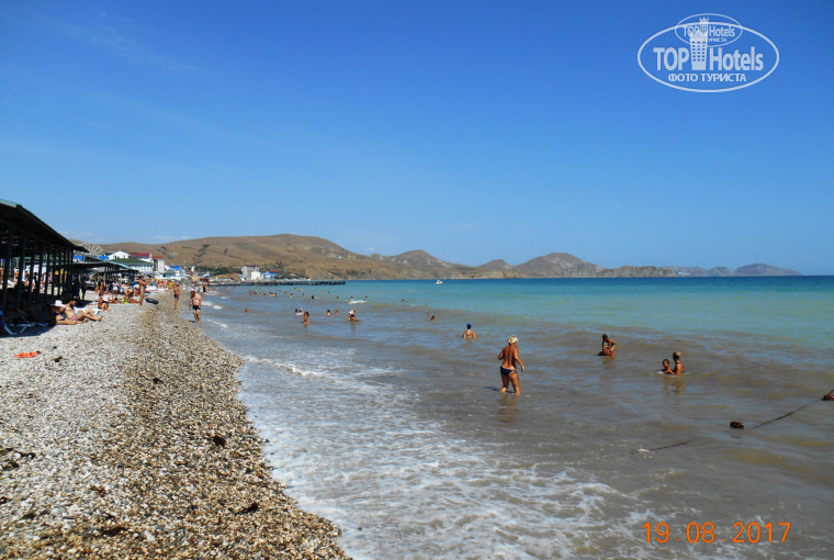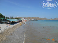 Пляж – мелкая и средняя галька. Заход в море – крупная галька, через несколько шагов – песок, поэтому даже при небольших волнах вода всегда мутная.