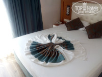 Прилетели мы рано утром,оставили вещи прям напротив ресепшена,а ценные естественно с собой(с собой так же взяли тапки и купальники) ,позавтракали и пошли купаться на море,чтобы время зря не терять.Вернулись в 11:00 спросили про номер(могут ли дать раньше)и нас заселили:),что было приятной неожиданностью. Номер дали отличный,с видом на дорогу(так мы и хотели,там тихо и спокойно).Уборку делали хорошо,лебеди с лепестками роз и тд,мыло,гель для душа ,не придраться :)