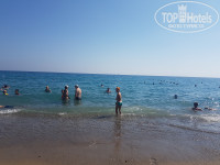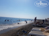 ПЛЯЖ. Отличный пляж. Чисто, широкая пляжная линия. Лежаков полно всегда, приходили в разное время, в основном с 9.00-10.00 до 12.30-13.00 и иногда после 14.30. После обеда очень много свободных лежаков, в том числе и на первой линии. Мы всегда приносили лежаки к морю, чтобы следить за ребенком. Через пару метров уже глубоко. Поэтому без присмотра не оставляйте. Пару раз были шикарные волны, ребенка было не увести с моря, было очень весело. Загорали всегда без зонтика, я ни разу не обгорела, использую всегда SPF50 для всей семьи, когда закончился стали использовать SPF30. Мазались 2 раза в день утром и после обеда. Днем море прозрачное, стоя по шее в воде, видно свои ноги. Когда были волны, вода мутноватая была. На пляже песок, при входе в море полоса камней, они круглые, не больно по ним ходить, специальная обувь нужна только для супер неженок, даже 1,5-2 летние малыши спокойно ходили босиком. Я ходила до воды в сланцах, т.к. мне было горячо ногам. А вообще супер полезный массаж стоп.