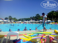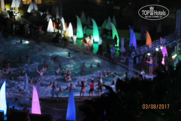 Отдыхали 10 дней в августе 2017 года. Остались отдыхом довольны.Плюсы- большая территория, хороший пляж, вечерняя анимация, ночной диско клуб.Минусы- народа много, отель большой. В столовой создается впечатление нахождения на вокзале.....муравейник, в общем. Но я была готова к этому. Бриллиант отеля- администратор Ирина на ресепшене. Решает все проблемы, быстро, вежливо, спокойно. Я наслаждалась наблюдая, как она работает. Специалист высокого уровня.Нам поменяли номер без всяких проблем и доплат, также добавили еврораскладушку в номер по нашей просьбе.... и даже доктор вынул рыбную кость из горла моей подруге....решали проблемы через Ирину. Еда- овощей много....тушеных , жареных... Мяса мало....Чай только в чайниках (турецкий). , пакетиков нет. Сок- юпи. Напитки- стандартные... Занимали пирс по утрам, там было гораздо прохладнее...бриз.. и купаться удобнее. Анимационная команда веселая, спокойна. Кто хотел- с теми и занимались...Артисты по вечерам приглашенные, был Кенийиский цирк...кто видел, знает. Хорошая детская анимация на сцене по вечерам... детки визжали от восторга.Большой респект администрации отеля за дискотеку в бассейне... было круто...еще такого не видела.... На финал был фейерверк .... было очень весело!!!Туристы -на 70 % русские....Вообщем какой я отдых планировала, такой и получился. Отель без особых претензий, но большой, зеленый,веселый и спокойный.Рекомендую другим.