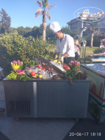 Здравствуйте! Очень рекомендую этот отель. Отдыхала с друзьями и их детками ( трое взрослых+ мальчик 10 лет и девочка 4 года) в июне 2017 года 21 день. Расселение у нас было 2+1. Подруга с матерью и малышкой очень быстро себе выбила номер, т.к. дала на ресепшене 20$. ее поселили очень быстро в шикарный номер с видом на бассейн и море на 4 этаже. Нас с другой подругой и ее сыном пытались запихнуть на 1 этаж с видом на пыльную дорогу и ещё на балконе искусственная вонючая трава. Но знание английского и громкий голос, и нас переселили за час на 4 этаж в отличный номер, правда без вида на бассейн, но и на том спасибо. Если бы мы как все приехали на 7-9 дней, мне было все равно, но на 21 день и за такие деньги, уж извините пришлось поскандалить. В номере удобные кровати, чистое белье, уборка в номере ежедневная, правда забывали бар пополнять бесплатный, приходилось напоминать. По поводу еды все отлично: салыты, мясо, рыбы, сыры, пицца, макароны, картофель, сладкое. Все супер только очень мало фруктов: яблоки, абрикос, арбуз и иногда персики, ни вишни, ни черешни, ни клубники. Мороженное с 10.00 до 18.00 около 6 видов. У нас была система питания ultra all, поэтому все напитки на баре бесплатные и коктели тоже. Бассейн чистенький, есть 3 горки. Есть бассейн для деток, правда как всегда мамашки из Челябинска бухали, а их дети писали в бассейн - выбирали отель без русских, а получился заезд практически одни русские и большая их часть с Челябинска и Питера - это жесть! Что касается аниматоров: ребята молодцы, и танцевали, и на зарядку звали, поиграть в игры разные. Вечером детская анимация неплохая, днём тоже работал детский клуб. Вечером наши аниматоры нас везли на дискотеку, правда платно. Территория зелёная, на полянке бегали кролики, деткам было весело. Хороший семейный отель. Из минусов это wi-fi, который практически ни где нормально не ловил, только в лоби на втором этаже был хороший сигнал. Ещё остаётся не комфортным заход в море - очень острые камни.
