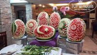 В ресторане без изысков. Для тех. кто любит овощи в любом виде-это просто праздник. Салаты никогда не брали. Только тушеные и свежие овощи в нарезке. Утром и днём с мясом, курицей и т.д.плохо. Зато вечером курица в тушеном виде в неограниченном кол-ве. На гриле мясо на любителя. Из фруктов только арбуз. Но зато какой!!! Спелый, сладкий, сочный.
