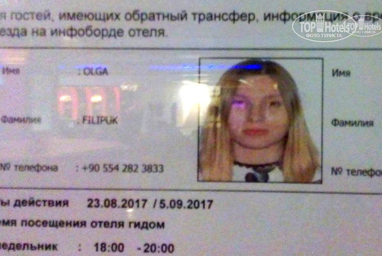 Оператор, который принимал нас в Турции, "Odeon tours". Трансфер от аэропорта к отелю - 5+!!! В отеле гид по фамилии Ольга Филипюк (OLGA FILIPUK) удивила своим невежеством. Учитывая, что мы были с двумя детьми и оставив ей документы ушли уделять внимание не ее рассказам о том, где лучше купить шубу и какой курс доллара у нее лично, а детям, она на следующее утро буквально бросила на стол наши документы с фразой "Я вам ничего говорить не обязана!". Не став вступать с нею в дискуссию, мы поняли, что в этом сезоне гид по фамилии Ольга Филипюк (OLGA FILIPUK), видимо, продала мало экскурсий по завышенной цене и улыбнувшись пожелали ей хорошего дня.