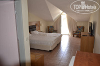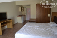 Мы прилетели в 23.00 по местному времени, заселили нас сразу, русско-говорящая администратор. Номера нам достались во втором корпусе, на мансарде. Номер достаточно большой, мебель конечно не новая, не в идеальном состоянии, но чистая и исправная. Порадовала огромная кровать состоящая из двух сдвинутых) всю мебель хорошо видно на фото. Из техники в номере - большой ЖК телевизор, на нем нашли даже наше ТНТ)))) холодильник, кондиционер, фен.