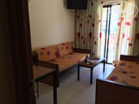 Нам достались апартаменты на втором этаже, где была мини-кухня с холодильником(! очень нас это порадовало, так как не ожидали что будет), спальня и комната с двумя диванчиками и телеком с двумя русскими каналами + балкон.