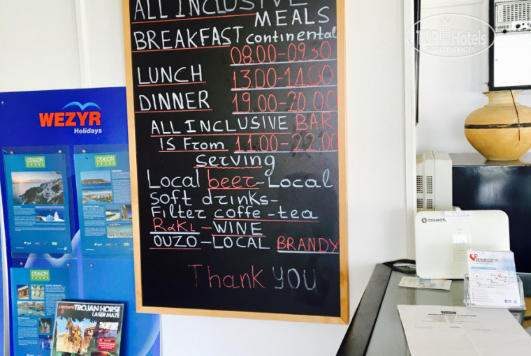 В этот отель мы попали по фортуне, вернее отправили нас в Hersonissos blue, но поскольку в отеле не было мест, произошёл овербукинг, хозяин отеля предложил отвезти нас в другой свой отель- в Hersonissos sun, желания тратить время и силы на выяснение отношений с отелем и туроператором у нас не было, да и сразу было ясно что в отеле просто нет свободных номеров поскольку когда мы приехали люди сидели на ресепшн вторые сутки ждали заселения, наотрез отказываясь от замены отеля-чего лично я не понимаю, всегда надо быть на позитиве и быть готовым к любым обстоятельствам чтобы твой отдых сложился. Вообщем приехала за нами машина и через три минуты мы были уже в другом отеле. В качестве компенсации и комплимента за наше спокойное отношение к ситуации нам дали двухкомнатные апартаменты вместо забронированного нами стандарта и бесплатный сейф. Лифта в отеле нет, номер на третьем этаже, чемоданы тащить пришлось моему мужу. Номер как номер, зато есть холодильник хороший, кондиционер и огромный балкон терраса. В Греции мы отдыхали уже много раз и супер ремонта мы от 2* и не ожидали. Ещё меня порадовал в спальне туалетный столик с большим зеркалом и розеткой рядом и лампой подсветки. Удобно было укладывать волосы и хранить косметику. Ну а теперь о плюсах и минусах подробно: плюсы: очень доброжелательный персонал, Никосу отдельное спасибо, даже когда в один из дней мы опоздали на ужин и на шведском столе уже все смели, персонал отеля вынес специально для нас все блюда, мы были очень тронуты. Отель работает на все включено, и надо понимать что это 2* на все включено- прекрасный вариант если вы хотите экономно отдохнуть в Греции и не парится при этом где поесть и сколько на это нужно денег(а на питание в тавернах денег уходит не мало), поэтому ждать кулинарных изысков не стоит. На завтраке-изумительный греческий йогурт +мюсли и мёд вкусный, яйца, сыр, ветчина, джем и хлеб, пару раз была шоколадная паста. Обед гораздо скромнее ужина, его мы и пропускали, обедая в тавернах чтобы не возвращаться в отель, а на ужин всегда очень много мяса-муж был доволен. Пиво нормальное, вино слабенькое, видимо разбавлено с водой, но не кислое . Крепкий алкоголь в баре не пробовали. Брали в магазине местный коньяк, если берёте метаксу, то берите не ниже 5 звёзд, а лучше 7. Вай-фай работает хорошо, ловит на ресепшн, у бассейна и вроде бы на втором этаже ещё сигнал был. До моря-3-5 минут, пляж в Херсонисос ни о чем, делать выводы о Крите, находясь только на этом пляжу не стоит, поверьте настолько разных и потрясающих по красоте пляжей я не видела нигде. Теперь минусы: отель находится у дороги-шумно, я после первой ночи сходила и в супермаркете купила беруши-больше проблем со сном не испытывала, муж так вообще спал как младенец и шум ему не мешал. Больше лично для себя я критичных минусов не заметила. Отель востребован, много заселялось и русских и иностранцев. Я прочитала отзывы об этом отеле и волосы встали дыбом-ну чего ждали люди от 2* в Греции? Вы бронируете самый недорогой вариант размещения на все включено на Крите и ждёте выбор из 33 блюд, хрустальных люстр и услужливых официантов? Отель чистый, еда свежая и вкусно приготовлена, есть выбор напитков, есть чистый бассейн и вай-фай только за это этот отель можно оценить по высшему баллу. Примечание: грязную посуду мы всегда уносили за собой сами, оставляли ча