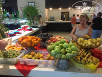 Много очень фруктов, абсолютно все, яблоки, виноград, гранат,дыня,арбуз ,киви,бананы , сливы,персики и тд, и что ещё понравилось что смело можно уносить с собой понравившейся еду или фрукт и никто не был против!так же по мимо ресторана есть сладкий уголок где с 11-17.00 можно пить кофе и кушать разные сладости,тортики с чаем или мороженое.