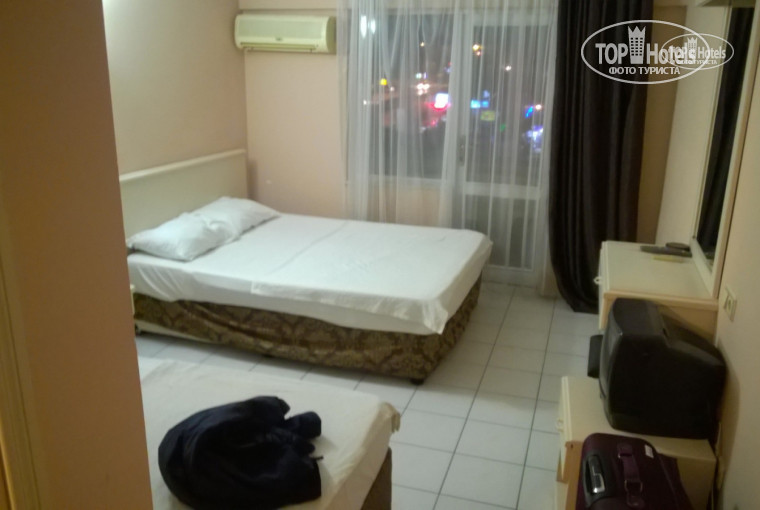 В номере для меня одного было: одна двуспальная кровать (на которой я воцарил водиночку) =), одна одноместная кровать. Старенький кондейшен (свою функцию выполнял), телик (который с трудом ловил 3 русских канала, в основном немецкий юмор), зеркало с тумбочкой (для девушек марафет наводить). Шкаф. В туалете туалетная бумага и фен (вроде был рабочий, не пользовался им ни разу). Короче впечатлений море.