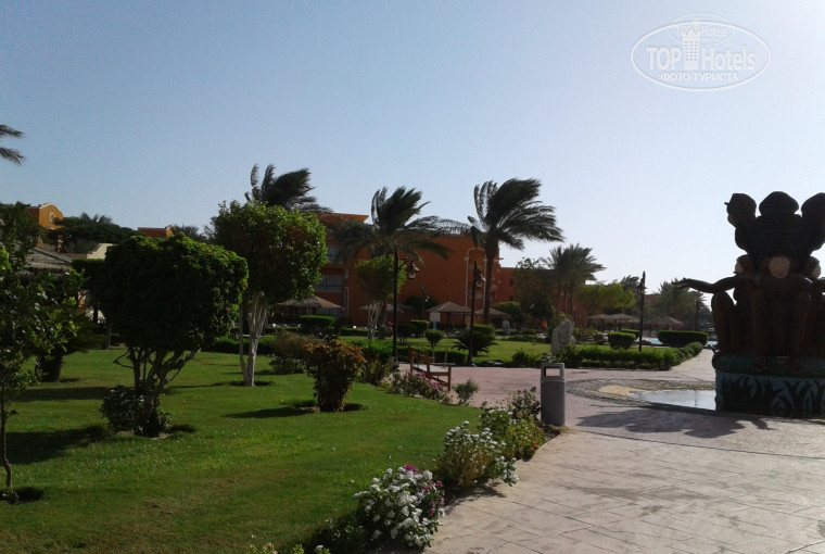 Ехали с компанией anex tour, прилетели в 6 вечера в Хургаду,в отель ехали больше часа,поскольку он находиться не в самой Хургаде. Отель находиться посреди пустыни,соседние отели где-то в 3-5км.На рецепции мы заполнили анкету и сотрудник отеля должен был показать наш номер,но мы вышли только из рецепции и он показал пальцем на типа наш корпус,развернулся и ушел. Минут через 10 мы нашли наш корпус,затянули чемоданы на 3 этаж. Номер почему-то достался 2-х комнатный,мебель старенькая,в ванной было 1 раскрытое мыло и все(гелей,шамнуней не было), чайника тоже не было,сейф бесплатный,все в пыли, постель грязновата, балконная дверь одна не закрывалась(на след.день ее прикрутили к стене наглухо).