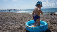 Море и пляж. Море чистое и красивое. Пляж - галька. Для маленького ребенка было хорошо, сидел, перебирал камушки, бегал и радовался. Для меня галька не очень приятна. Не очень понравился заход в море. Сначала нужно слегка спуститься к морю, т.к. оно намывает камни и получается что-то типа небольшого спуска. Дальше заходишь - мелко, проходишь ещё - резко по пояс, дальше постепенно углубляешься и казалось бы вот оно - поплыл, появляется глубина, преодолеваешь волны и хоп - каменная плита, встаешь - по пояс. Первый раз думал разобьюсь об неё на волне. Переплыв плиту попадаешь в море с хорошей глубиной. При выходе из моря преодолеваешь сначала первый перепад глубины, а потом подъем туда, где оставил тапки. С весом под 100 кг было не просто наступать на камни, хотя можно было купить тапочки и не думать об этом. Хороший пляж с песком в самой Алании.