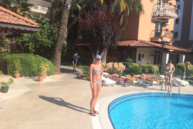Были в отели в конце августа , в начале сентября с мужем. Отель очень маленький, номера такие же маленькие, нам достался номер на первом этаже, балконом сложно назвать то , что там было)) Еда в отеле конечно не очень, не помню было ли там мясо вообще, в общем очень, очень скудно по еде. Сама территория отеля крохотная, бассейн хороший ( ныряли , бесились в нем) . Море очень было теплое и чистое, идти наверное минут 7-10. Но по пути всякие магазинчки и т д .Вообще люблю Турцию , но в этот отель конечно же больше не поедем