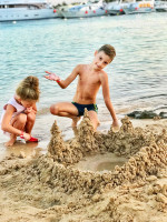 На пляже всегда весело и жизнь кипит . Много деток, весело хохочут , плещутся в водичке . По пляжу водят верблюдов - деткам нравится и кататься и просто смотреть на двугорбых красавцев !