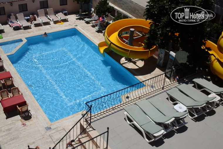 Территория отеля маленькая, но уютная, апельсиновые деревья растут. Два бассейна, один холодный, другой – нормальный. А если после холодного в нормальный прибежать, то от теплым даже кажется. Есть горка, но она работала всего лишь час в день, утром.