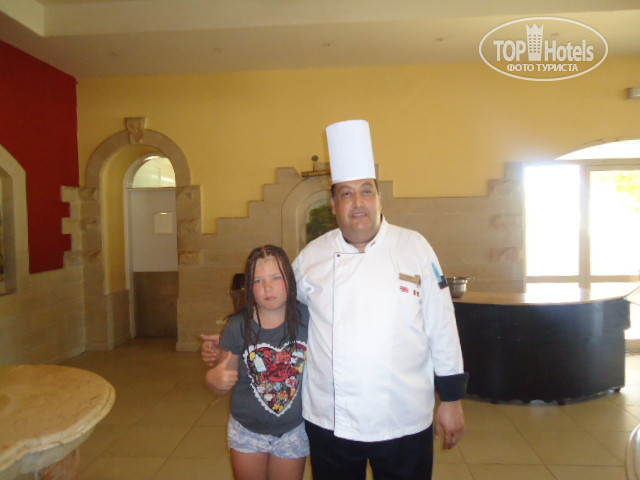 На завтрак давали: кашу, колбасу, яйца, омлет,хлопья, кофе, чай, молоко. Обедали в основном на пляже.Брали картофель жареный, шарики из шпината и хот-доги.На ужин ходили в европейский ресторан (картофель фри только там) . Очень понравились кальмары, рыба, курица на гриле, выпечка, фруктов мало и все нарезанные.В основном давали финики каждый день, дыни и апельсины.