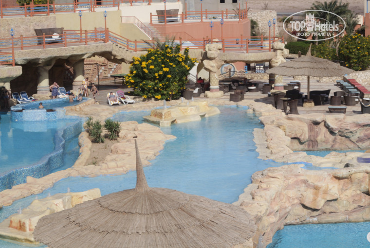 Отдыхали 3 взрослых человека, на 7 дней. Вылет из Киева задержали из-за снегопада на 12 часов, но Шарм Эль шейх встретил нас солнцем, лёгким ветерком с моря. С каждым днём погода была лучше, штиль и + 28. Разместили в начале в 2х местный, но сразу поменяли на соседний 3х местный (без шоколадок и доплат). По-русски говорят плохова-то, но в общем объясниться можно. Номер подуставший, но все работает, все есть: душ, фен, холодильник, плазма с русским муз.каналом и Беларусь 24 :) белье чистое, хотя пыльно и в ванне ржавчина. Бассейн - супер, есть небольшой с подогревом и джакузи, есть возле бара (бар Пещера понравился по дизайну), дальше большой бассейн с островом, и фонтаны, которые включали каждый раз во время обеда (обед подавали у бассейна, завтрак и ужин в ресторане). Еда норм, мясо, рыба, рис, макароны, картофель, шашлык-птица, завтрак яичница, и много сладостей, тортики, желе, голодными не ходили. Алкоголь, как обычно местный, желающие умудрялись упиться))) пиво норм, но подают в 150 мл стаканчиках, как и другие напитки. Пляж просто шикарен!!! 150 м песчаного пляжа, слева есть кораллы, маски пригодятся (можно купить в магазине Джордж Клуни селиконовую с трубкой 10 уе, простые 5 уе), на пляж каждые 30 мин ездит автобус, ехать 4 мин, или пешком 5-6 мин. Вечером бар за ресепшеном до 12 ночи, есть кальян за 1 уе. Персонал улыбчивый, внимательный, за всеми следит управляющий. Видно, что очень стараются угодит. Понравилось как для 4ки в принципе все! Жаль, что зима и мало гостей, или тому вина, что отель далеко от центра, но хочется, что бы люди не боялись сюда ехать, кроме старых номеров, все остальное на хорошем уровне 4*. На территории есть ещё большая зона с 3х ярусным бассейном и детской площадкой, не смотря на то, что было мало людей, все работает, и бассейны полные водой, везде подсветка. Из анимации - просто отличные парни, привет главному аниматеру Алексу, очень нас веселил, не хватает дискотеки на самой территории отеля.