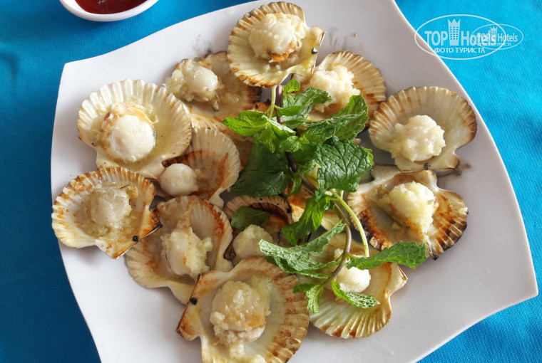 Обедать и ужинать ходили в кафе, смотрели цены в ресторане отеля они в 2 раза дороже. До кафе пешком минут 10-15, по набережной быстрее чем через город. В кафе "У Толика" всегда вкусно и холодные свежие фреши. Обстановка простая, обычные деревянные столики, никаких скатертей и украшений. Пусть вас это не смущает, еда очень вкусная и не дорогая, меню на русском. В кафе "У Пушкина" та же ситуация, на вид - не презентабельное кафе, но все очень вкусно, меню на русском. Мы кушали у Толика и у Пушкина: пробовали мурену, ската, змееголовую рыбу, очень полюбили гребешки, креветки, крокодила с ананасами, страуса. Есть и привычные пюрешка с говядиной, тоже очень вкусно. Понравился вьетнамский салат с морепродуктами и орешками, он подается с чипсами местными, и в них же накладывается. Заходили в пиццерию, но там дорого и кушать кроме пиццы нечего, пицца хоть и вкусная, но мы вышли голодными и направились дозаправиться в Пушкин.)))