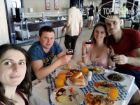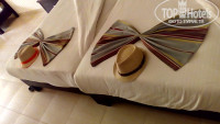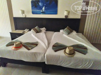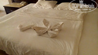 Почну з самого початку: до готелю ми їхали рівно годину, оскільки перед цим зупинялися у решті готелів, прекрасний гід Ридазустрів нас одразу ще біля автобуса і провів на рецепцію, нас одразу поселили, але попередили що у нас номера стандартні, і якщо ми хочемо з гарним видом з вікна то треба за кожен день доплатити по 2$, ми сваритися не хотіли тому одразу заплатили за 7 днів 14$ хоча впевнені що це був розвод, але то таке) ну звісно це перший мінус. В результаті ми отримали номер на другому поверсі з виглядом на басейн. Номер- дуже просторий сім'я там спокійно помістилася б, а так як нас було тільки двоє то нам взагалі було чудово. Прибирали у номері щодня, але чесно скажу на трієчку, все прибирання складало - миття полу, застелення ліжка (постільну білизну не міняли), зміна тільки рушників та поповнення засобів гігієни у ванній.Не дивлячись на все це я залишилася повністю задоволеною (хоча я дуже бризглива). Зате прибиральник завжди робив щось цікавеньке нам з рушників та подушок, то квіти, то лебеді, то слоника 9чи хто то був), бабочки з нашими шляпами, все це є на фото. Так як ми приїхали до готелю о 10 годині і запізнилися на сніданок, гід нас провів у лоббі бар на пізній сіданок, там ми добре посмакували закусками, соками, чаями)) Після заселення одразу побігли до басейну і там я познайомилася з першим аніматором (незнаю як звуть), він проводив водну аеробіку - дуже цікава штука :) Раз вже заговорила за аніматорів то продовжу, аніматори дуже дружелюбні, вприципі як і решта персоналу, завжди зацікавлювали нас то аеробікою, то зарядкою, то йогою, то зумбою, то танцями живота, так так ми так і танцювали і спортом займалися :) Що вечора аніматори щось цікаве влаштовували:Містер готелю, факір шоу, караоке, дискотеки і т.д. Не можу сказати що я ходила на ці всі заходи, певно тому що я приїхала сюди помилюватися красою природи і навіть ввечері бігала дивитися на море :)