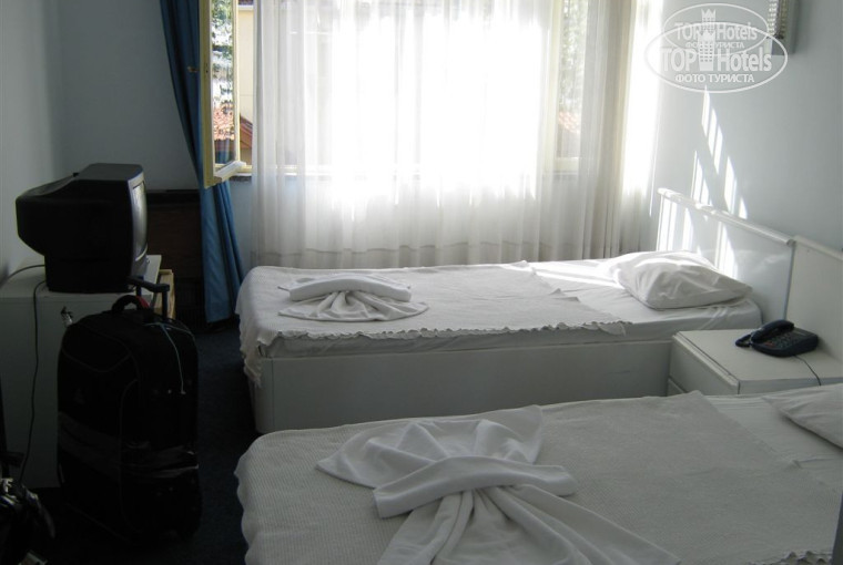 А ...так как везде, 2 кровати, тумбочка с низким зеркальцем, 2 прикроватные тумбочки, синее ковровое покрытие все в пятнах. Телевизор БЕЗ русских каналов.