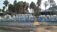 3. Пляж песчано галечный. Для тех,кто заходит в море с берега, наверное,не очень комфортно. Но мы ходили по деревянному настилу до пирса и с него в море- или по лестнице ,или прыгали с высоты...супер,дух захватывает! Вода чистая и теплая! Плавать можно далеко..до буйков. Всегда есть свободные лежаки. Души и чистый туалет рядом. В отзывах пишут про речку...несколько раз рано утром чувствовались прохладные области воды около пирса и не более. В бассейне не плавали, напугали нас вирусом! Но мы больных не видели,родители купались даже с совсем маленькими детьми! Бассейн приличный по размеру, с виду чистый, лежаков много, душ и туалет тоже рядом.