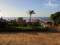 Протяженность пляжа около 100-110 м, включая немаленькую зону серф-станции. Лежаков достаточно, но стоят они довольно тесно, в основном в три ряда в зоне выхода от бассейна. За серф-станцией еще одна пляжная зона, но она узкая и вытянута в сторону отеля. Здесь же расположена волейбольная площадка. Во время нашего отдыха заполненность отеля позволяла чувствовать себя на пляже очень комфортно. Можно было выбрать по лежаку под отдельным навесом каждому. Пляж и заход в море полностью песчаные. Пляж периодически кое-как убирается. В песке достаточно мусора (трубочки для коктелей, крышки от бутылок, окурки), но особого дискомфорта нет. Небольшой уютный бар с напитками. Две зоны для купания отгорожены. Заход пологий и заканчивается сначала отмелью, а затем в районе буйков глубина 1,8-2 метра. Волны на воде за десять дней были один раз, когда ветер дул со стороны Шарма. Кабинка для переодевания находится за серф-станцией. С правой стороны серф-станции (если стоять спиной к морю) будка для выдачи полотенец.