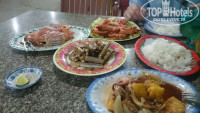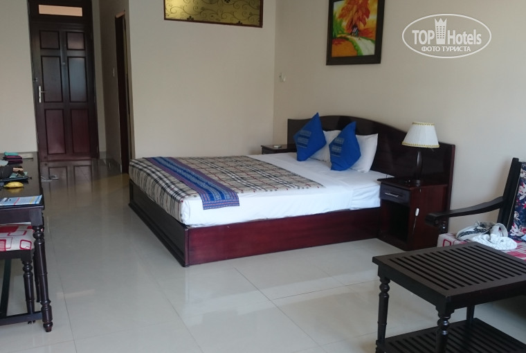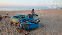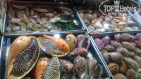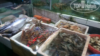 Расположение у отеля удачное – в шаговой доступности все магазинчики и кафе. До вьетнамских Боке можно пешком – из отеля и направо, но будет час-полтора ходьбы, можно на зеленом такси (самое дешевое) - примерно 40 000донгов в одну сторону ( это около 100 руб.). Боке – это открытые кафешки на берегу моря, где можно поесть свежих морепродуктов и рыбу, выбирая прямо на прилавке или в аквариуме. Средний чек с напитками на двоих – около 500-700 тыс. донгов (1 300 – 1 900 руб.), это примерно будет полкило гребешков/мидий, 4 устрицы, 1 крупный кальмар или краб, 8 королевских креветок, какая-нибудь рыбка (луна, сибас, пагр), овощной салат, рис и 2 бутылки пива.