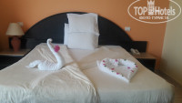 НОМЕР. Как видно на моем единственном фото номера (в отзыве), номерной фонд староват. Главный корпус отеля, где находится ресепшен, был отремонтирован, именно там интерьер в бежево-бирюзовых оттенках, как показано на фото самого отельера, а в нашем номере мебель была черного цвета и темно-бордовые шторы. Уборка нормальная, но что называется "без фанатизма")))). Постель чистая, белоснежная. Полотенец на нас четверых всегда хватало.