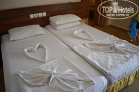 Отель оставил приятное впечатление! https://www.youtube.com/watch?v=-EHpKzUgQ0A Отдыхали 2 взрослых и 2 детей:5 и 17 лет. Номер был семейный в 1 корпусе. При открытом балконе слышимость с улицы великолепная!-) но, учитывая что на улице +40 градусов, кондиционер работал практически круглосуточно. При закрытых окнах и включенном кондиционере, слышно только кондиционер! Но поскольку он дул прям в голову, спали ногами в изголовье,укрывшись простыней. В первой комнате сдвинули две односпальные кровати (там где дул кондиционер), во второй его не было и на двухспальной кровати спали дети. Естественно дверь в спальню была всегда открыта......Номера убраны чисто и аккуратно,можно ходить босиком. Мы вешали табличку "не беспокоить" и в номер никто не заходил. За 10 дней мы 2 раза ее поворачивали, когда надо было поменять полотенца и пополнить шампуни/гели/бумагу. Персонал отзывчивый и доброжелательный. Еда...голодными не останетесь....на завтрак всегда есть яйца, омлет, зелень, помидоры, огурцы,оливки, различные хлопья, соевое молоко, свежии булочки, масло,сыр,мед,джемы,апельсины. Колбасу и сосиски старались не брать (на нее смотреть страшно, не то что есть). На обед: два вида супа (пробовали однажды...похоже на разведенный кетчуп), всегда есть тушеная курица,котлетки соевые, котлетки из печени, рис, картофель фри, вкусный лаваш, овощи в различных вариациях, очень вкусный салат с консервированным тунцом, апельсины, сливы,абрикосы, один раз было картофельное пюре. На ужин всегда давали арбузы, котлетки на гриле (однажды были из настоящей говядины). Напитки:вкусный местный гранатовый и яблочный чай, кофе хороший,ну и юпи разных цветов. В баре кола,фанта,виски,вино,пиво,ракия местная. Весь алкоголь разведенный, пьяных замечено не было. Бассейн на высоте. Чисто и обрабатывают каждый день. Ребенок сказал что море соленое и холодное и сидел в бассейне. Море теплое +26....это залив, поэтому волн нету, дно-песок,который мутит воду. Мне, выросшей на р.Волге казалось что я в реке, а не на море. До пляжа 3 минуты ходьбы. Пляж мелковат, поэтому ходили плавать чуть влево, где городской пляж, без лежаков. Ездили на 4 экскурсии (многовато для 10 дней). Все экскурсии понравились очень: Дальян (крабалка https://www.youtube.com/watch?v=7VHP2uUzDKs,черепахи https://www.youtube.com/watch?v=GFsJKqCsJKw ,ликийскии гробницы,грязевые источники https://www.youtube.com/watch?v=d8HV5I9koac, эгейское море), Остров Клеопатры https://www.youtube.com/watch?v=CwW3gxTLWXA (открытое море, г.Акекова,пляж с великолепным песком), Памуккале https://www.youtube.com/watch?v=LxU9hgUTMTc&t=16s (это вообще чудо света,посмотреть надо всем раз в жизни точно) и обзорная в г.Мармарис https://www.youtube.com/watch?v=GhNNMUq4eWw&t=83s (ее нам дали в подарок от Пегаса). Все экскурсии покупали у Пегаса (хотелось надежности, ведь с нами маленький ребенок). Обзорную покупать отдельно нет смысла потому что это шоп-тур с заездом в крепость Султана Сулеймана https://www.youtube.com/watch?v=Aav5xuTxL-c&t=35s (крепость находится прям на набережной, куда ходят маршрутки из Ичмелера стоит 3 лиры, ехать 15 минут), ювелирный центр рядом с большим Мигросом, Меха,кожа (аксессуаров кожаных там нет) и магазин лукума где его 85 видов...по 65 лир кг. (напробовались основательно)...но лукум покупали в магазине, напротив отеля, прям на углу как идти на море (видов конечно не 85,зато цена 45-55 лир). Продукты при необходимости покупали в Мигросе (на выезде из Ичмелера) https://www.youtube.com/watch?v=PT8Dgkz30iA&t=11s, ходили туда пешком. Там же пок
