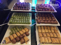 Нельзя не сказать про еду: разнообразный шведский стол, частично подстроенный под русских, хорошее детское меню, а не нагеттсы с картошкой фри. Что то менялось, что то повторялось, но выйти полусытым было невозможно, мы всегда наедались. Один день в неделю ужин посвящен морепродуктам (крабы, огромные и обычные креветки, кальмары, мидии), а так всегда есть мясо, в т.ч. на гриле, рыба жаренная и рыба на пару, овощи, салаты, макароны, индийские блюда, запеченные овощи, 2 вида супов (один раз был борщ с говядиной), разнообразие сыров (даже российский), из фруктов мы ели только арбузы, достаточно вкусные, пахлва очень вкусная, есть мороженное, очень много всего. Деткам - каша гречневая на воде, манная каша, овсянка на молоке, молочная рисовая каша, овощное пюре, были фрикадельки несколько раз, очень мягкая говядина - резала маленькими кусочками и давала, отварная рыба, супчики, бульоны. В ресторанах есть детские стульчики, приятно что на них лежат одноразовые приборы с салфетками, чистые стульчики сверху накрыты пленкой, стульчиков хватало всегда.