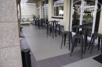 Территории у отеля нет, здание квадратное, лицевая сторона с ресепшн смотрит на море, боковые - с боковым видом на море, задняя - на бассейн с маленькой лужайкой. Перед входом в отель слева - небольшая терраса со столиками и баром, где каждый вечер аниматорщики устраивают тематические вечера, программа вечеров висит на ресепшене. Напитки в баре на террасе бесплатно до 10 вечера, в 10 ч. бармен бьет в гонг и халява заканчивается.
