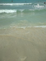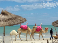 Пляж в 2 минутах ходьбы, новый деревянный настил, белый песок не идеально чистый, но убирался по мере сил бич боя (граблями сгребались водоросли и колючки), лежаков всем хватало, попадались лежаки с трещиной, выбирайте целый, если весите не 50 кг. Вход в море плавный, море ласковое и приятное. Собирали ракушки с детьми на берегу и прыгали на волнах. Торговцы не имеют права подходить к лежакам, верблюды, лошади и их владельцы ходят вдоль кромки моря и зазывают туристов. Катание на верблюде стоит 20 динар 15 минут (2 места). Платки хорошего качества (мейд ин Турция) и приятных расцветок можно купить за 15 динаров 2 шт., тогда как в магазине в туристической зоне столько стоит всего один.