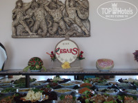 Здравствуйте,была в цезаре два раза,и собираемся этим летом в третий.Я и моя семья просто обожаем этот отель.Цена-качество-спокойствие,без помпезного пафоса,всё компактно и уютно.Напишу вам мои впечатления об отеле.Заселение-у нас всегда выпадает приезд на вечер-так что с заселением проблем никогда нет,заполнили бумаги и вперёд в номера.Номера отличные и просторные,есть где разгуляться),в Турции отдыхали 9 раз ( в Сиде и Белек и Кемер ),не во всех отелях такие большие по площади номера,бывало так что ходили трамвайчиком в проходах.У нас всегда заселение в главный корпус ( указывает Тур-агенг ) .Номера-убирают хорошо и регулярно,всегда есть банные принадлежности,бар пополняют каждый день.В ванной всегда у ребёнка отдельно привезённое с дома полотенце бамбуковое ),слава Богу уборщицы ни разу его с собой не захватывали,это радует). Территория и сам отель не большой,простой и компактный,всё близко и под руками,далеко ходить не нужно,территория чистенькая и ухоженная.Ресторан-еда вкусная и разнообразная.Любой человек голодный не останется,на обед вкусные супчики,горячее,салаты,выпечка,десерты,фрукты-что ещё нужно.Также всегда много разнообразной еды в Аля-картах и на пляже.Тарелки,вилки,скатерти-успевают менять всегда,проблем с этим я не видела.Персонал старается-молодцы!Сервис отличный как в отеле так и на пляже,никто не хамит,все приветливые и дружелюбные.Море и пляж-лежаков,матрасов достаточно,хватит всем когда бы не пришёл.Персонал убирает и следит за пляжем ( чисто ). Море-отличное для детей,пологое и до глубины нужно пройтись,на пляже и в море песок,гальки нет.В отеле есть сувенирные магазинчики,а так же рядом с отелем отличный базар можно скупиться чего душа желает.Кто в думает ехать ли в этот отель и сомневается - езжайте и не пожалеете.Цена-качество полностью себя оправдывает.Я скажу так были в разных отелях и разной ценовой категории,и от некоторых есть разочарование,но про этот отель я так сказать не могу.Душа лежит,полюбила его,так как не видела я в нём недостатков,поэтому и еду к вам Цезарь снова,ещё и везу с собой большую семью)),и надеюсь на хорошее приветствие и хороший отдых,и тогда обязательно мы вернёмся опять же к вам!!!По возвращению напишу отзыв или что-нибудь поменялось!