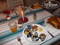 На обед и ужин 14 горячих блюд,из которых минимум раз в день кус-кус.плов и макароны с мясом и специями,рыба на гриле.2 вида мяса на гриле и минимум одно блюдо обжаренные в масле тесто ,либо какие нибудь овощи в кляре.Есть три вида соков типа юппи,5 видов газированной воды,чай с мятой.Из алкоголя в ресторане пиво и вино:красное.розовое,белое.