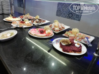 В отеле все предусмотрено по времени.Завтрак с 7.00-10.00 (блинчики, яичница, много вкуснейшей выпечки!, овощи, рис и др) если проспали то в Джоли пабе можете позавтракать с 10.30-11.30. Обед с 13-15 в основном ресторане (бобовые, картофель, говядина , курица, овощи, фрукты) и на пляже фудкорт ( хотдоги, овощи, пицца, картофель фри), Полдник у терассы (плов и сладкий пуддинг ) . ужин до 21,00. Всего всем хватало. Из морепродуктов была "жареная рыба"- голова без хвоста, мидии с песком, и единственно вкусная рыба в кляре! Тунец жареный очень острый. И нам, как гастритчикам, все блюда были острые. Десерты и выпечка очень вкусные.
