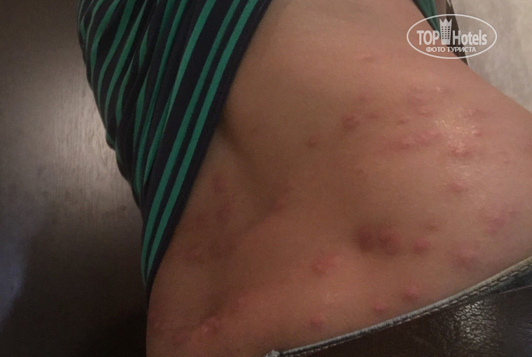 На второй день я заметила в номере насекомых, было утро, по сыну ползает насекомое, убиваю, кровь, поднимаю одеяло , ещё с десяток, а под простыней лучше не смотреть было, меня искусали они так, что этот отдых я вспоминала долго. У меня пошла страшная аллергия. Обращались к врачу, сделал укол и дал мазь, но ничего не спасало, отдых был испорчен. Слава богу сына не успели покусать. Мы сразу же сказали на ресепшене, нам сменили номер, забрали всю одежду в химчистку. За это спасибо! На фото видно, какая реакция от клопов пошла на всём теле. Лечилась я около месяца, зато теперь у меня появилась солнечная аллергия, которой в жизни ни разу не было.