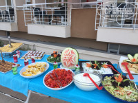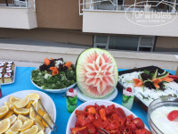 Завтрак: хлопья всех цветов радуги !! :D Молоко добавляете и всё)) Каша есть. На улице жарят яишницу. Горяченькую сразу возьмете)) Сыры разных видов ( один вид плотный сыр, другие типа брынзы с разными приправами и степенью солености, творожный сыр). Помидоры, огурцы, колбасы, сосиски. Овощи запеченные, особенно кабачки, баклажаны, кабачки. Разные виды варенья, особенно вкусное из розы)) Из фруктов всегда были дыня, яблоки, иногда , апельсины, грейпы. Арбузам был не сузон, но сказали, что дают